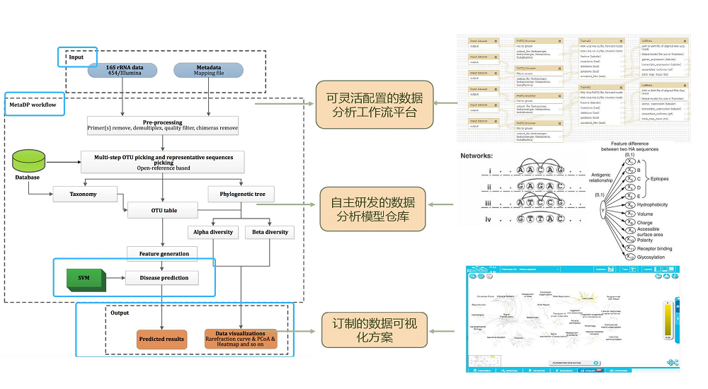 微生物信息化平臺(tái)基于生物信息學(xué)、多組學(xué)整合、人工智能等多項(xiàng)技術(shù)的綜合運(yùn)用,研發(fā)出一系列原創(chuàng)性算法,以實(shí)現(xiàn)對(duì)生命組學(xué)數(shù)據(jù)的深度挖掘;并通過(guò)將BI與IT技術(shù)進(jìn)行整合,構(gòu)建了從數(shù)據(jù)整合、數(shù)據(jù)管理、工具訂制到數(shù)據(jù)可視化的高通量測(cè)序數(shù)據(jù)分析平臺(tái),可實(shí)現(xiàn)數(shù)據(jù)分析和科研及臨床醫(yī)學(xué)的深度融合。